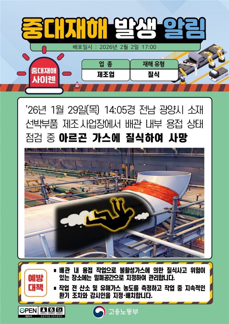*재해 예방대책 - 알곤작업시 밀폐공간 작업시 질식위험이 있으므로 환기설비 점검 - 아크광선이 강하므로 주변 작업자의 시력을 보호하기 위해 차광막 설치 - 용접 지점 하부와 주변에 방화포를 설치할것 - 배관 내부에 가연성 가스나 유증기가 남아있는지 확인 - 홀더 및 케이블의 피복 절연 상태가 양호한지 확인 위에서 강조하는 사항들을 잘 지켜서 이번주도 즐겁고 안전한 한주가 되시기 바랍니다.